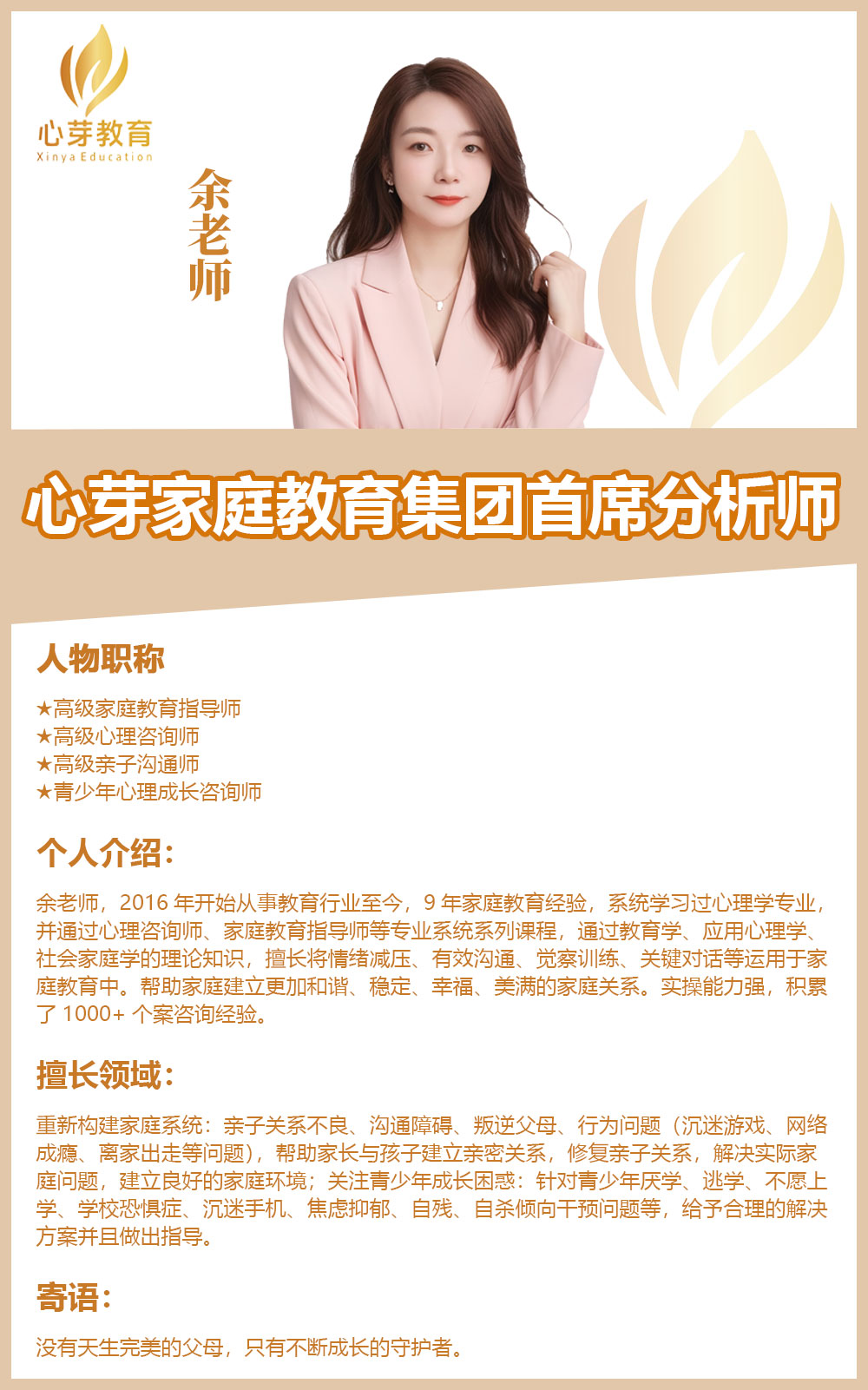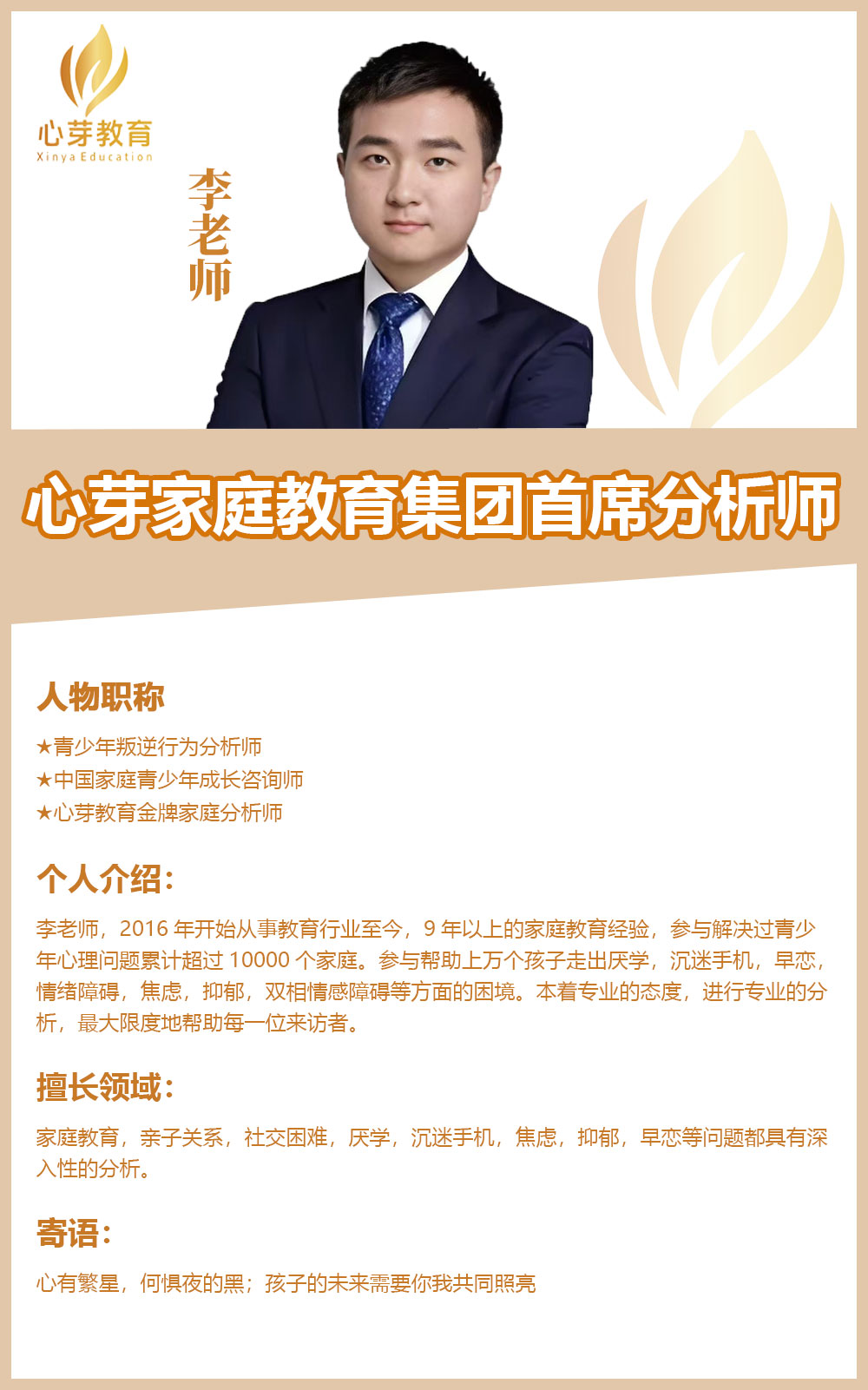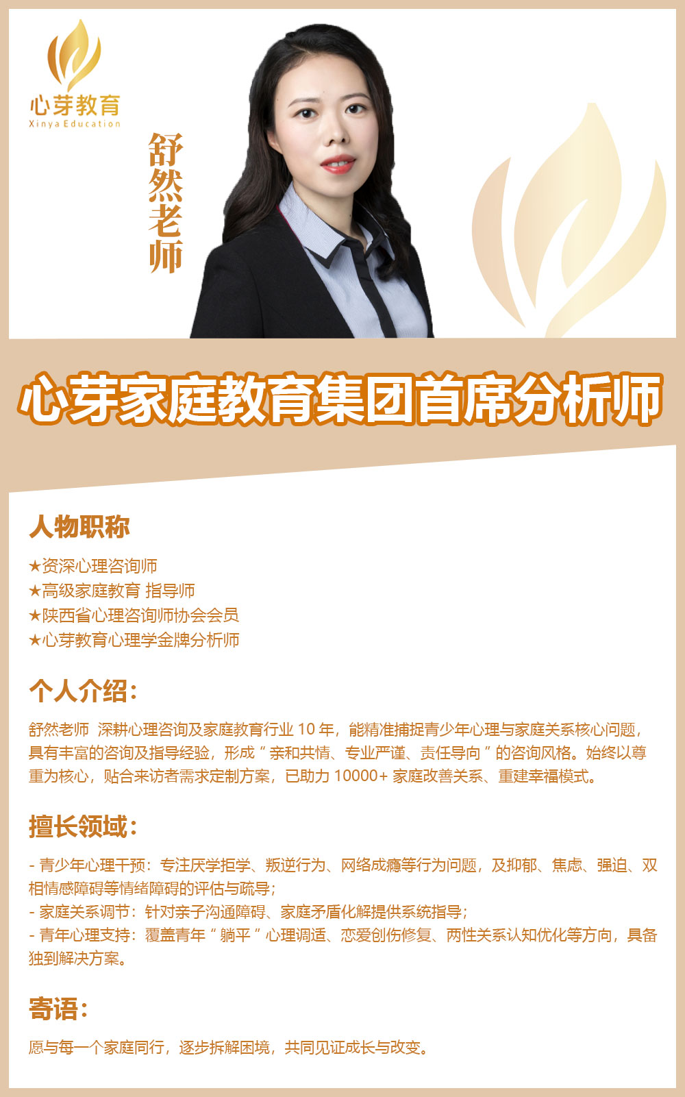 心芽教育从2017年发展至今,解决了上万名孩子的教育问题,帮助了上万组家庭走出教育困境。 我们专注为所有家庭提供:教育咨询辅导、针对性的成长计划、亲子教育互动、学习学业规划、心理障碍疏导、家庭关系调节等服务。我们有着成熟的线上线下解决方案,旨在系统解决教育中出现的厌学、叛逆、网瘾、社交、亲子关系、心理障碍等核心问题。 心芽教育由教育专家、心理学导师、教育顾问组成专业的教育团队,根据每个家庭的具体问题和需求,提供定制化的解决方案。帮助家长创造一个充满“爱、支持、积极”的家庭环境,进而改变孩子问题、促其正向发展。 “心芽教育,让每一颗心灵茁壮成长,让教育从心开始!”